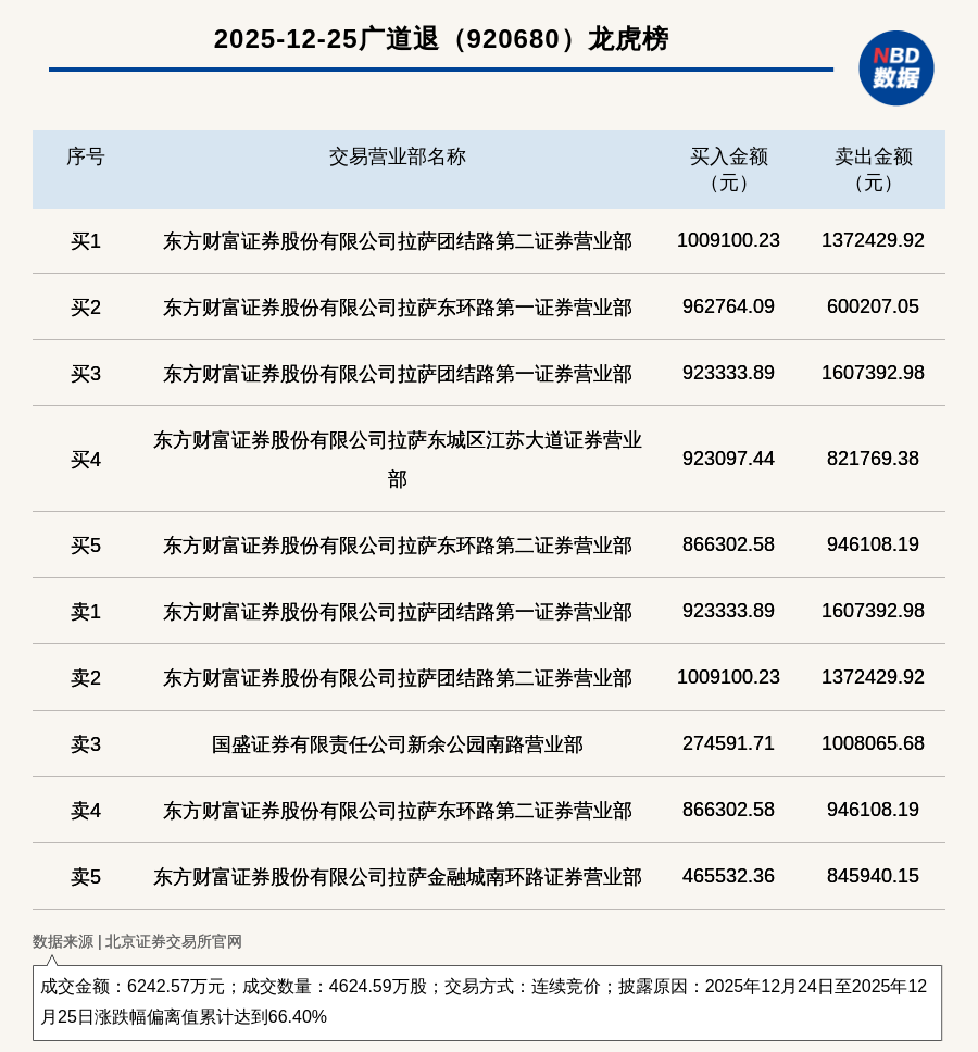 每經(jīng)訊,2025年12月25日,北交所上市公司廣道退(920680,收盤(pán)價(jià):1.71元)登上龍虎榜,交易方式是連續(xù)競(jìng)價(jià),披露原因是2025年12月24日至2025年12月25日漲跌幅偏離值累計(jì)達(dá)到66.40%,成交數(shù)量4624.59萬(wàn)股,成交金額6242.57萬(wàn)元。買(mǎi)一席位為東方財(cái)富證券股份有限公司拉薩團(tuán)結(jié)路第二證券營(yíng)業(yè)部,買(mǎi)入100.91萬(wàn)元;賣(mài)一席位為東方財(cái)富證券股份有限公司拉薩團(tuán)結(jié)路第一證券營(yíng)業(yè)部,賣(mài)出160.74萬(wàn)元。