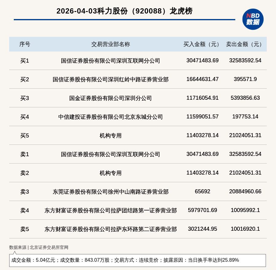 每經(jīng)訊,2026年4月3日,北交所上市公司科力股份(920088,收盤價(jià):60.21元)登上龍虎榜,交易方式是連續(xù)競(jìng)價(jià),披露原因是當(dāng)日換手率達(dá)到25.89%,成交數(shù)量843.07萬股,成交金額5.04億元。買一席位為國(guó)信證券股份有限公司深圳互聯(lián)網(wǎng)分公司,買入3047.15萬元;賣一席位為國(guó)信證券股份有限公司深圳互聯(lián)網(wǎng)分公司,賣出3258.36萬元。