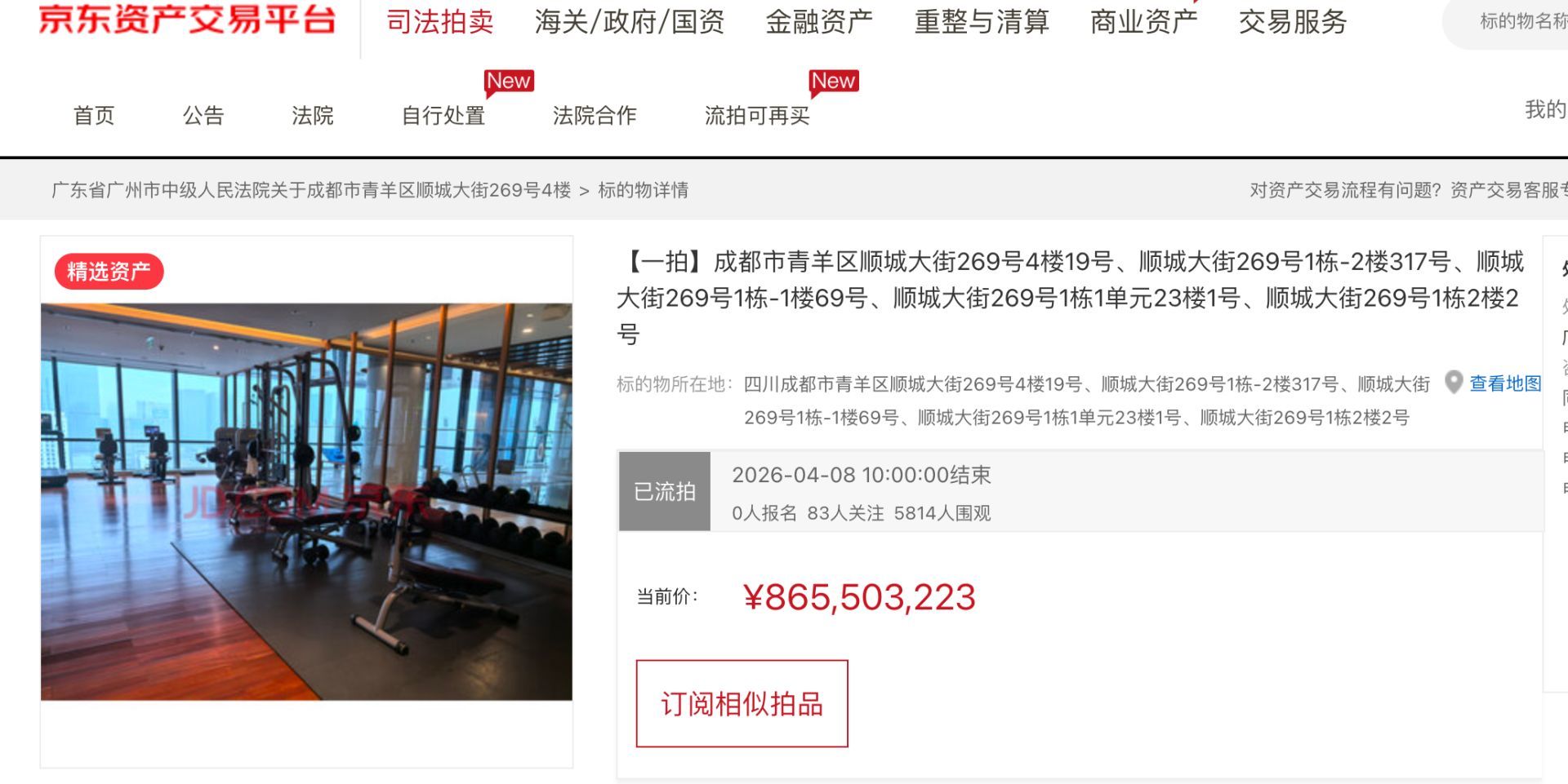 京東司法拍賣平臺發(fā)布的公告顯示,本次拍賣標(biāo)的為成都市青羊區(qū)順城大街269號的酒店相關(guān)房產(chǎn),建筑面積53278.13平方米,由成都富力熊貓城項目開發(fā)有限公司持有。標(biāo)的物評估價為9.6167億元,起拍價定為8.655億元,競買保證金高達8655萬元,加價幅度為432.75萬元及其整數(shù)倍。