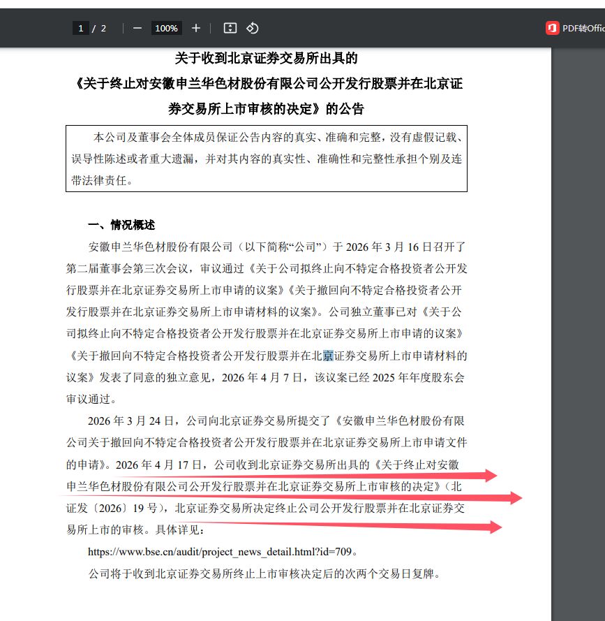 該決定很快獲得監(jiān)管層面的回應(yīng)。2026年4月17日,公司正式收到北交所出具的《關(guān)于終止對(duì)安徽申蘭華色材股份有限公司公開發(fā)行股票并在北京證券交易所上市審核的決定》,上市審核就此正式終止,標(biāo)志著公司本次北交所IPO之旅徹底落幕。