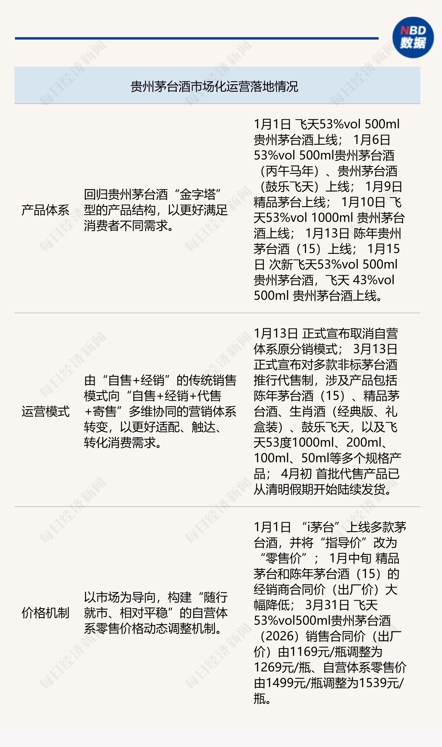 1月13日,茅臺正式宣布取消自營體系原分銷模式。3月13日,茅臺正式宣布對多款非標(biāo)茅臺酒推行代售制,涉及產(chǎn)品包括陳年茅臺酒(15)、精品茅臺酒、生肖酒(經(jīng)典版、禮盒裝)、鼓樂飛天,以及飛天53度1000ml、200ml、100ml、50ml等多個規(guī)格產(chǎn)品。