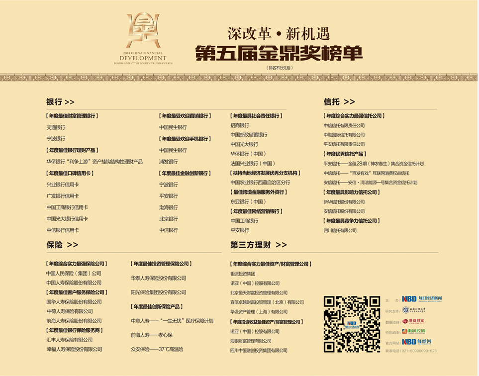 由《每日經(jīng)濟(jì)新聞》主辦的一年一度的“2014中國(guó)金融發(fā)展論壇暨第五屆金鼎獎(jiǎng)榮譽(yù)盛典”活動(dòng)即將拉開(kāi)帷幕,本次活動(dòng)以“深改革?新機(jī)遇”為主題, 從財(cái)富管理的角度關(guān)注金融業(yè)的發(fā)展新趨勢(shì)。本次金鼎獎(jiǎng)活動(dòng)作為《每日經(jīng)濟(jì)新聞》年度大型金融行業(yè)活動(dòng),已經(jīng)成功舉辦四屆,均獲得圓滿成功,得到了行業(yè)內(nèi)各大金融機(jī)構(gòu)的關(guān)注和認(rèn)可。