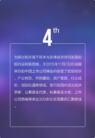 上市公司領袖峰會是由每日經濟新聞主辦的中國資本市場最具影響力的大型交流平臺,最重要的年度盛會之一,峰會自2011年發(fā)起,迄今已經連續(xù)舉辦五屆。2017年第六屆中國上市公司領袖峰會將以“新時代 新機遇 新擔當”為主題,匯聚中國數百家優(yōu)秀上市公司、上百家券商基金機構,邀請政府官員、商界領袖、學界專家齊聚成都,共話財經宏圖與資本愿景。